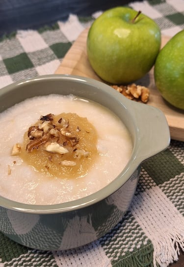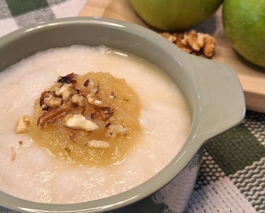 Rogers Rice topped with apple puree and walnuts - your carbs, fruit and fiber combo!
